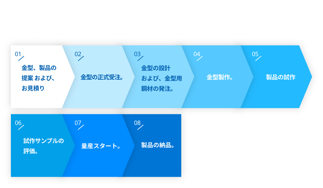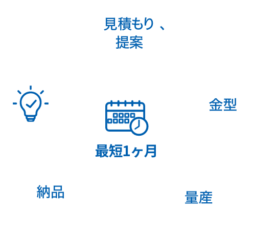 提案・お見積り~金型~量産まで最短1ヶ月。スピーディーな立ち上げで、製品の市場投入を加速します。